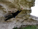 クライミングビデオ「CONTACT」の最後に登場する、非常に特徴的な岩です。高さ2〜4メートル135度の石灰岩の前傾壁が長さ50m以上にわたり続いています。超ガバホールドがいっぱいあります。ガバホールドしかないのでインドアの様なダイナミックな課題が多くなりがちです。インドアの感覚で飛びついて足が離れると体が後ろに吹っ飛んでしまうので危険です。どこでも登れてしまうので、仲間と課題を作りながら登るのが面白いでしょう。>> ビデオ