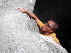 今日ははじめはランアンドジャンプスラブへ行く。名前の通り走って岩に飛び乗るのがちょっとおもしろい(別に難しいわけではない)。Takenoriさんは皆が苦戦しているスラブをスタンスも見ずにスタスタ登ろうとし、案の定ズルズル滑る。本人は怖くないらしいが、見てるほうがドキドキ。