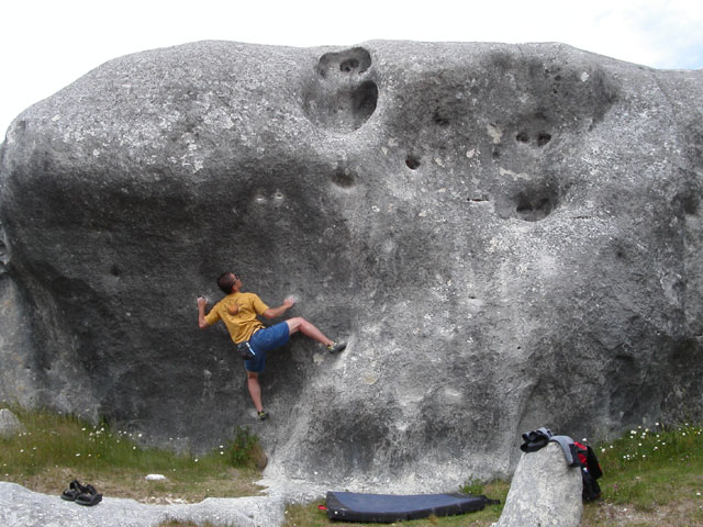 結局岩についたのは5時過ぎ。一面の草原の上に白いLimestone(石灰岩)の岩岩岩岩岩岩岩。まるそうな岩がたくさんある。課題は千個以上あるらしい。僕は外岩にボルダリングをしに行ったことは今まで一回しかない。それも冬のアヨロ(登別)で超寒かった。ボルダラーはけっこういる。とりあえずメインのエリアであるQuantum Fieldの真ん中へんへ行く。適当にV4に皆でトライしているところに若い日本人が3人やってくる。3人ともワーホリできているボルダラー。
