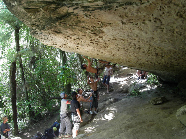 今日は日本人8人の大グループで行動。Creese Wall(Track 1)の簡単なルートでアップしたあとWall of Thugs(Track 5)のPaynesでもっとも有名なルート、「1080 and the Letter G」(23)にボルダラーズとKenさんと僕で挑戦。ガイドには"One of the wildest sport routes in NZ"と書かれている。巻き道を20mほど登ったところのレッジがスタートで、かなりの高度感のある10mほどのルーフ。下は何もなし。ホールドはガバガバで途中身体の入る穴があり、そこに足でぶら下がり逆さまの写真を撮るのがお約束。Kenさんがヌンチャクをかけに行き、僕は一応フラッシュ成功。ロープクライミングの経験がほとんどないボルダラーズには怖いこのルートを、高さにビビりながらも皆頑張る。最後にKenさんがRPし、回収はダウンクライム。既に去年登っているMaxはすぐ近くの「Mea Culpa」(27)にトライを開始。KenさんはGlobe Wall(Track 4)の、去年からの課題という「Creative Confusion」(27、ダウングレード26という話も)にヌンチャクをかける。雨が降り出したのでKenさんとMax以外は早めに戻る。夜はかなり激しく雨が降った。