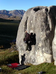 明日は休日なのでWanakaへ行ってもトポが手に入らなそうだし、途中にあるHulk Hogan WallやElephant Rocksもおもしろそうだ。どうしようか考えているうちに、Wanakaへの最短コースを外れてTimaruのほうに来てしまったので、明日はHulk Hoganで遊ぶことにする。Hulk HoganはOmaruから西に少しのDuntroonというところにあるボルダーな岩。クライミングビデオ「CONTACT」の最後のほうに登場する岩である。夜中12時過ぎ、Duntroonの集落から岩場のほうへ向かうと、真っ暗ながらも岩の気配をがして二人とも興奮気味。Elephant Rocksは暗すぎてよくわからなかったが、Hulk Hogan Wallは道路脇なので岩を確認できた。このあたりは石灰岩ばかりみたいだ。岩場をちょっと過ぎたところで適当にテントを張って寝る。