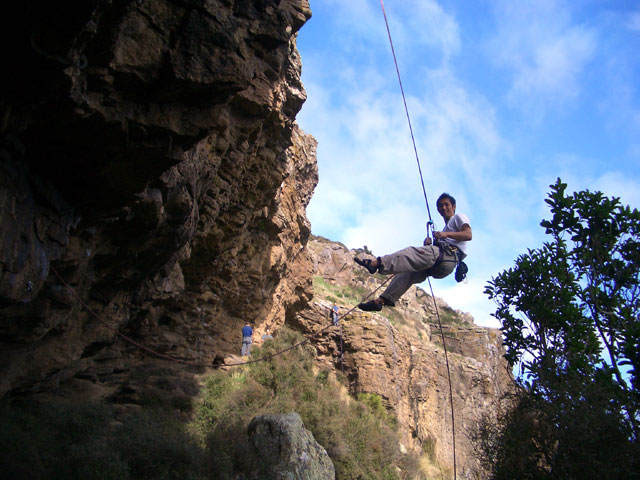 メインであろうHospital Flatエリアの駐車場からはちょっと離れた、Riversideというエリアに行く。ここには25程度で星のついたルートがならんでいて、僕らにはちょうどよさそうだ。今日は天気がよくてとても暖かい。アップで15のルートに取り付いたつもりが実は23のルートで、スタートから遠いムーブがでてきてテイク。さらに中間部でかなりのランナウト。最後も悪くて、一刻も早くこのルートから降りたかった。やぶくんがこの壁の真ん中を行く三ツ星の25、「Lollapalooza」に目をつけ、二人でトライ。最初と最後に核心となる小ハングがあり、中間の垂直なフェースもおもしろい。それなりのレストポイントが、最初の核心の後と最後の核心の前にある。なるほど、なかなかすばらしいルートだ。僕はそれなりのレストポイントでの回復力は人よりあるらしく、2撃に成功。やぶくんは2トライ目、3トライ目ともに最後のハングでおしくも落ち、精神的にもお疲れの様子。調子にのった僕は、二つ星の23に取り付きオンサイト成功。NZオンサイトグレード更新。